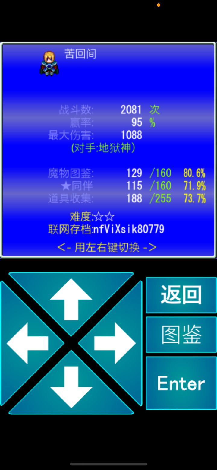 看图,这是我玩的大致情况,因为图片数目限制只发这些。看了看网上战斗次数有不到一千就通关的(暂且不提是否开挂,还有难易程度),我这个档两千多了还没通惊恐。因为各种原因导致这个存档的时间跨度有五年以上,这个月能找到这个档也是万幸。对战时间不计入总时长,所以游戏时长才那么点(但我确实是花了很长时间的)每次找回存档时都会徘徊很长时间想一下剧情进行到哪了,有几次不得已查看攻略。来来回回整的我