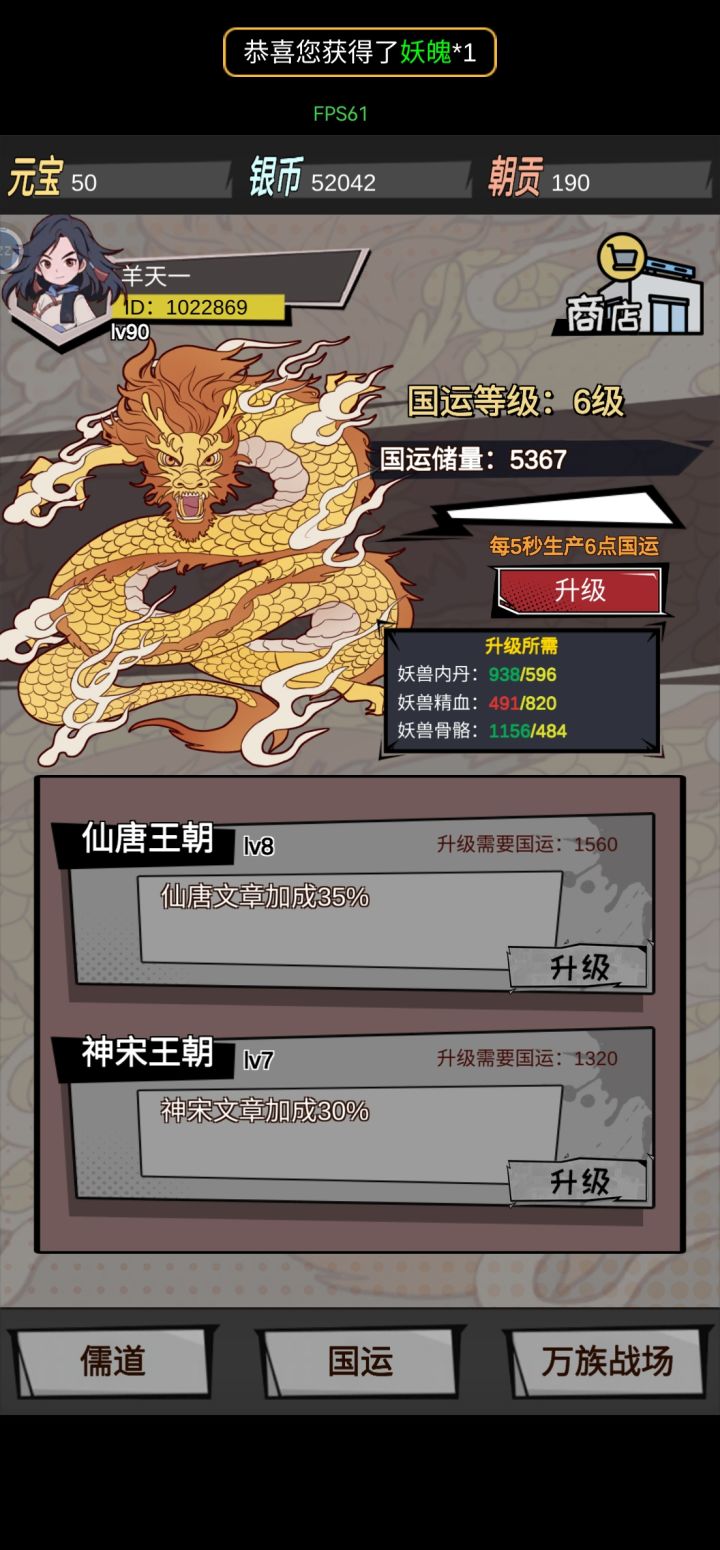 1.商城里的内丹、精魄、骨骼这三种国运升级材料,不是一个一个卖的,实际上是100元宝100个,1000元宝1000个,不要看见贵就不买了。2.50级妖圣在80级地图,9~10万攻击可以试试,挂几个小时上线,背包里有1元红包(500元宝)或者技能里有新技能,就代表打过了。3.万界精魄:商城购买开启,三件套激活属性,消耗元宝巨多,普通精魄9万起步,30万满十件套,稀有精魄30万元宝起步,可能开到相