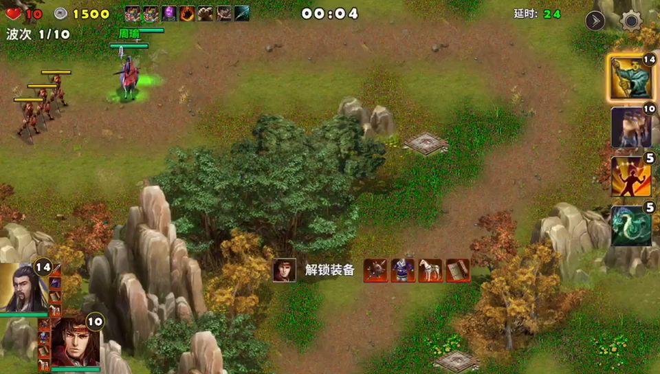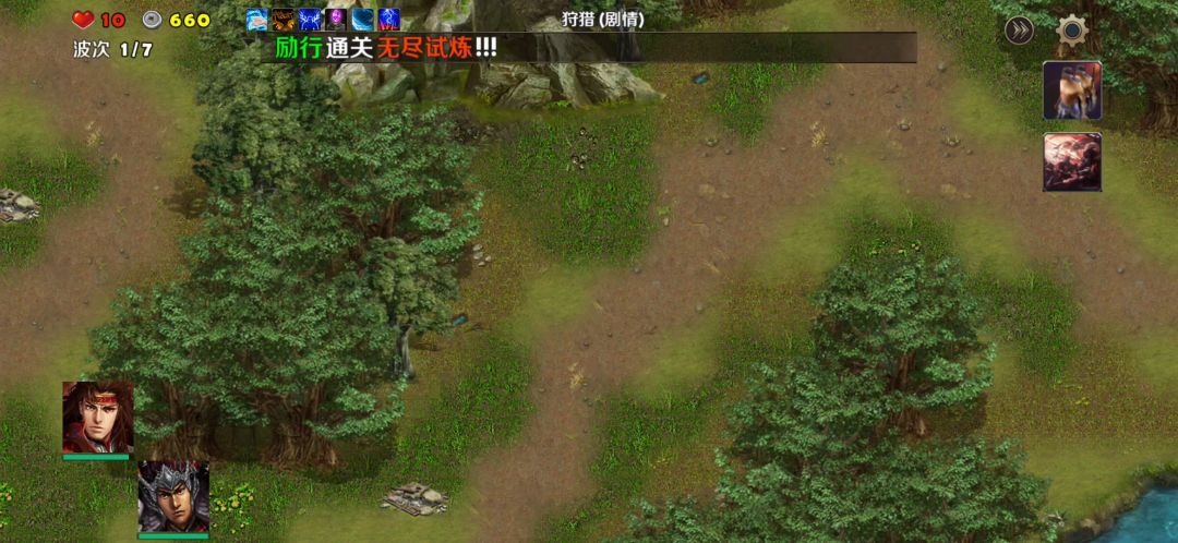 英雄:太史慈、周瑜 塔:天雷塔 卡片:术塔精通、引雷、神火雷、桃园结义、破敌 打法:开局太史慈和周瑜一定要去角落堵好口子别让小狼出来,就这样坚持到第三波,我们可以建造第一个天雷塔,用天雷塔主要是伤害高带麻痹,毕竟这个图只能做三个建筑所以要最大化伤害,第三波一到,太史慈和周瑜就要去右边出兵口等着刷兵,左边就不用管了有天雷塔在那里打。第五波就可以把剩下的塔都造满,接下来就是贴身孙策轻松过关了