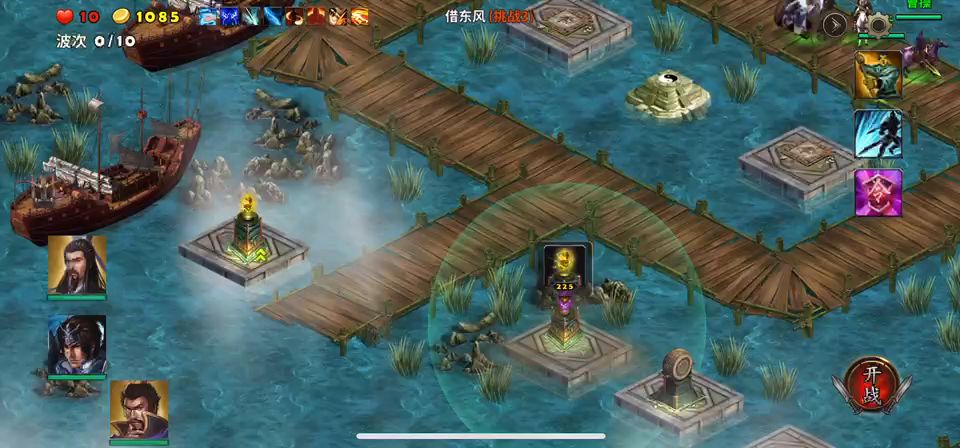 守天关的借东风这一局不好打。选好自己喜欢的武将后,塔防选用级别高的火焰塔或者天雷塔,搭配上各种战术卡片,游戏随着难度的增加。敌军不怎么好打不说,还有好多大乌龟上岸骚扰,最难的地方还是最后一轮的BOSS,我感觉也就之能用火焰塔加上毒箭塔过这个图,尽量不要开加速了,最后的BOSS不要等着它靠近诸葛亮。先去一将打,死了再换一将,这样车轮战术慢慢靠死它。