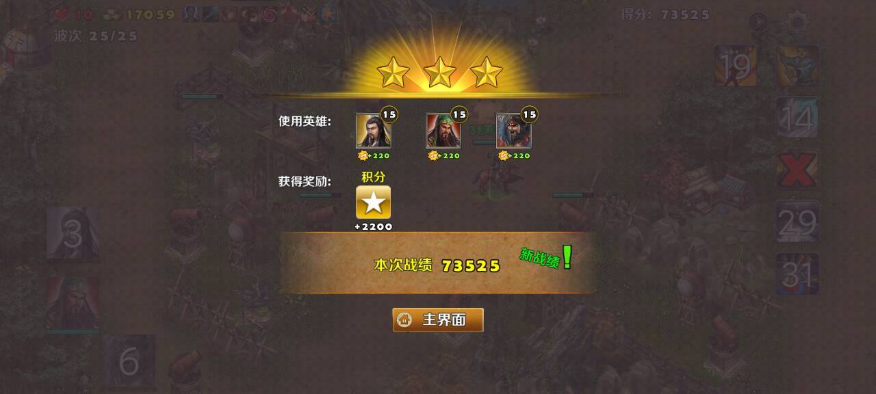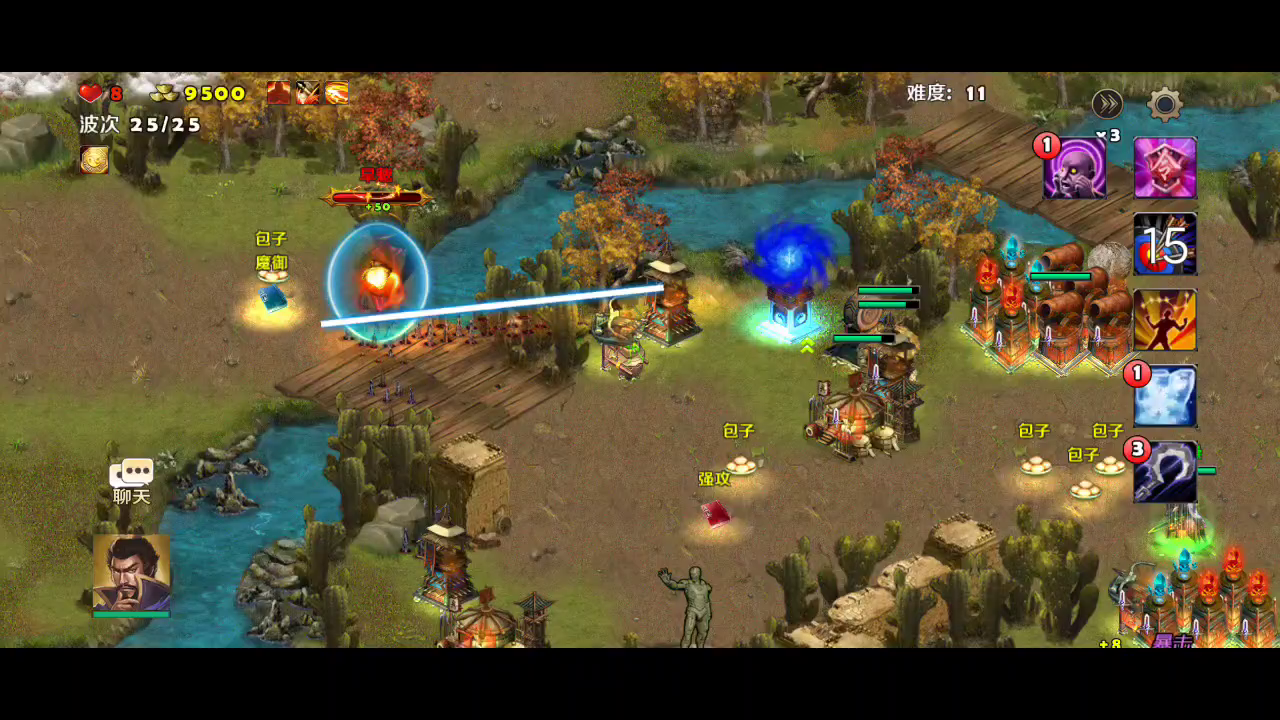 这是剧情第二章的最后一个关卡了。灭吕布的战斗打响了。还原历史演义开局武将选取了刘备和曹操,塔防选火焰塔和远程弩箭塔,战术卡是破敌和妙手回春。火焰塔可以有力的减杀敌方小兵,远程弓箭塔可以补刀,一般没有难度,选的武将就守卫自己的大本营就好,大本营只要不被敌人摧毁,坚持到敌人的进攻结束,就过关了,一般都是三颗星。视频献给新的玩家参考~!!