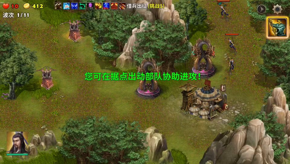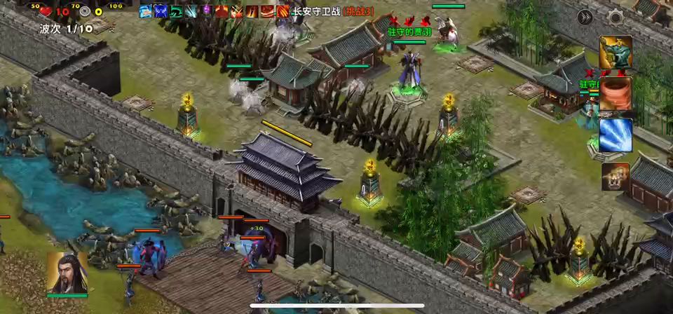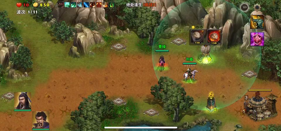 英雄:刘备 打法思路:开局买防御塔,基地下方建造粮仓技能点加金币,门口左边建造轰天塔,右边建造狙击箭塔,最上方出兵口建造巨炮塔,前期猥琐一点打打小兵升下级,等级很重要!中后期就可以去杀boss刷装备了。刷新的狼不能放过这都是钱!有钱就买防御塔后面在升级基地的防御。中途打不过的时候可以在神机营购买500的士兵他会出来帮忙守城!