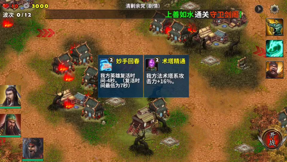 来到了清除余党这一关卡,开局选用刘关张三将出战!塔防选用弩箭塔防作为主要输出单位!这一关敌人两路出兵,残杀出来的难民,我方武将应该尽量的保住难民不被杀掉。如果有难免被杀会被扣生命值,还要防守好大本营,防止敌人偷塔成功。大本营需要用远程的弓箭塔配合火焰塔打防守~!通关视频请参考!