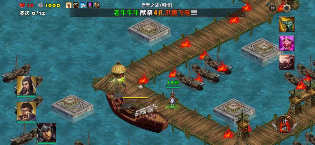 防御塔:天雷塔 卡片出装:富豪、桃园结义、妙手回春、术塔精通、固诺金汤 打法思路:太史慈守下路,刘备曹操去右边上路守两个出兵口,这关最好不要开加速,太史慈不能站在一个地方不动,要躲避黑船的子弹,如果太史慈死了,我方基地一下就摧毁了。所以太史慈要风筝,另外基地里要买小船轰炸黑船,黑船毁了以后就可以开加速随便打了。