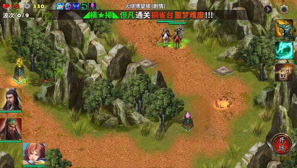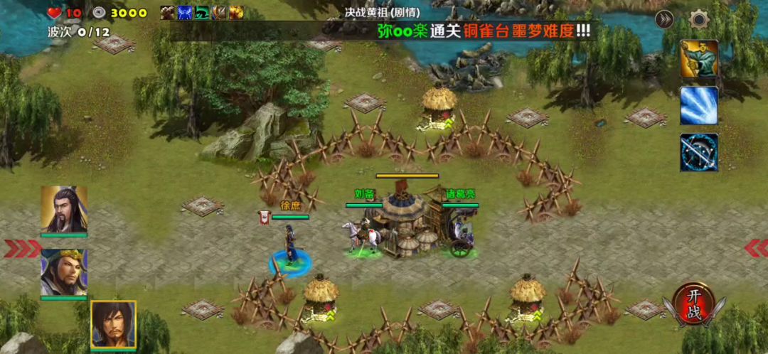 血战长坂坡难度3首通战斗打响了,开局前把参战的刘备和黄月英两个武将都武装到牙齿后,塔防选用雷电塔就可以,我比较喜欢给敌人过电玩,进入游戏先把左边的塔防建造起来,武将待机增援,哪里有敌情就去哪里配合塔防消灭它们。敌人一共10次进攻,要留意左边出敌口,我们有2个自己人要出来,需要保护着安全到达右边出口。总体不难,请参考视频