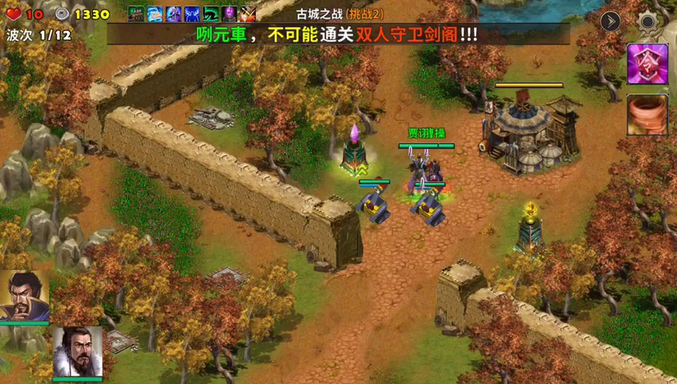 古城聚义度过了剧情过卡难度关卡的首通就开启了。过了就有奖励。这一关可以选取两员武将参战!本局用的是曹操和贾诩,塔防用的是天雷塔。战术卡片选取加成天雷塔的神火雷和引雷,弱敌和破敌等。本局没有什么难点,敌人12轮的进攻。注意中间的投石车就行了。武将不就守着自己的大本营。通关视频请参考!
