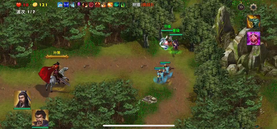 挑战难度3的狩猎不好打,通关就有几率获得里面的擂鼓台碎片,用了升级擂鼓台。擂鼓台在剧情地图里面用的不多,但是娱乐地图里面的群英阁和魔塔杀阵经常用到,守卫剑阁和虚鲲更少离不开,是有必要刷一刷的,这局推荐参战武将用刘备曹操,塔防用雷电塔。配合上对应的战术卡片去刷碎片吧,一天几局很快就能毕业。通关视频请参考