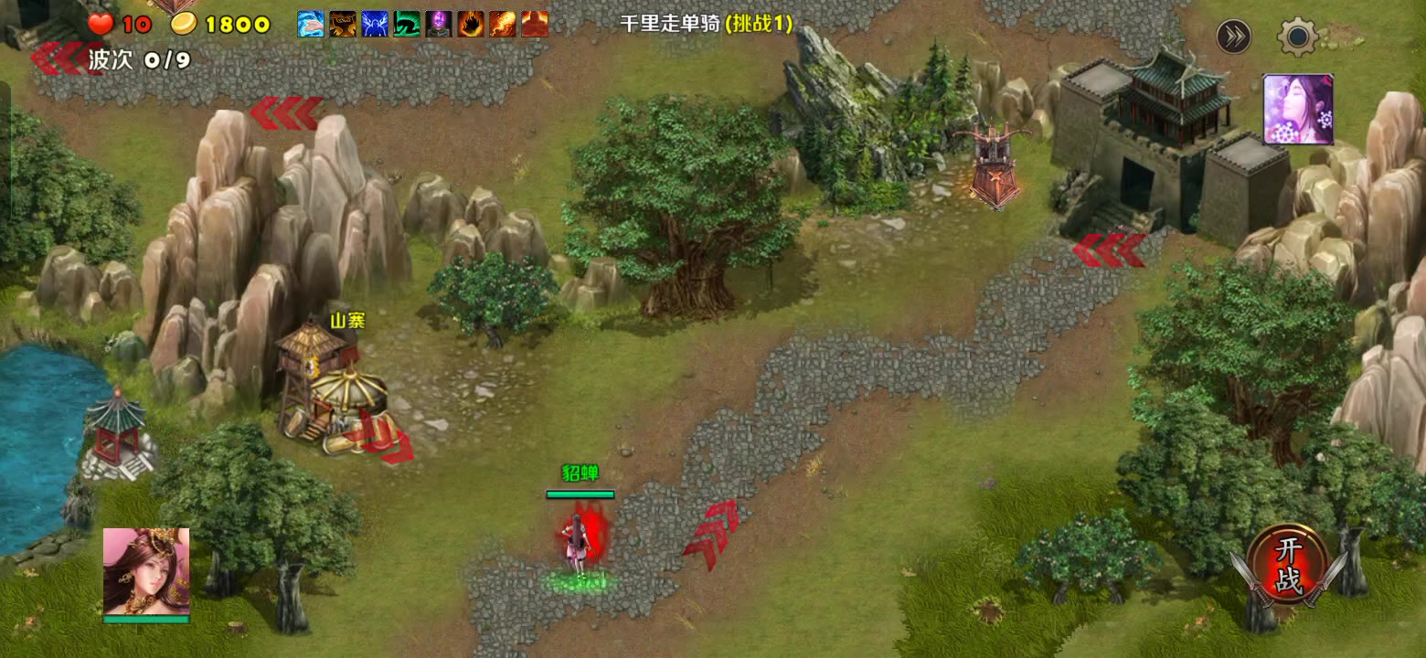 副本增益:副本里可以直接建造六级导弹塔(无法攻打孔明灯) 敌方增益:我方和友军有50%几率不能攻击敌人 推荐英雄:刘备贾诩 核心装备:雪橇车 防御塔:导弹塔、冰冻塔(大导弹塔只能建造一个,小导弹塔没有限制) 后援:圣兽、霹雳车 打法思路:第三波以前还是先建造三座小型导弹塔不升技能,然后留钱建造大的导弹塔,由于导弹塔不能攻击第十波的灯笼部队所以我们还需要建造副塔冰冻塔(天雷塔、狙击箭塔都可以),在雪