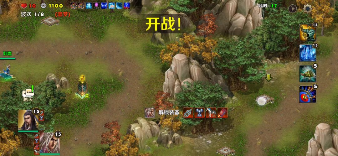 英雄选择刘备、关羽,防御塔使用火焰塔,战术卡使用破敌、术塔精通、修罗堡垒、三昧真火、紫气东来、妙手回春,英雄装备如视频所示。 进入地图首先在两边路口建造2座火焰塔,左边防御塔技能升满级,两个英雄分开防守两边路口,一切准备就绪之后,开战! 由于火焰塔攻击范围比较小,同时初始敌人也比较弱,所以刚开始要用英雄辅佐防御塔去击杀敌人,灭掉敌人有机率掉落各种属性晶石,可以用英雄去捡晶石镶嵌到防御塔上面,增