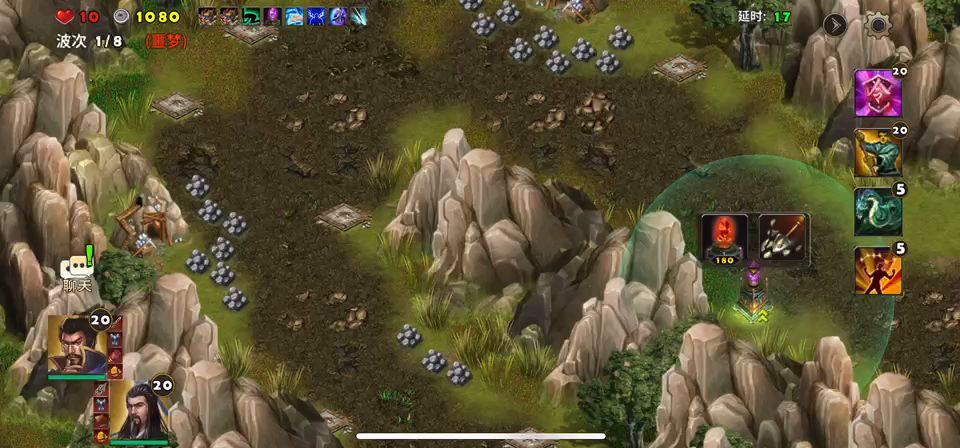 英雄:刘备、郭嘉 防御塔:天雷塔 后援:玄武、霹雳车 副本被动:我方技能战术卡冷却减少20%,我方移动速度减20% 打法思路:开局两个出兵口各派一位英雄守着,出兵口位置建造天雷塔先不升技能,第三波重点去右边出兵口支援技能和后援全部用出来快速秒掉boss然后郭嘉回左边,等最后一波刘备在右边出兵口投放士兵以后迅速来左边集合打boss,这里有远、攻属性宝石优先给左路防御塔使用,主要是最后boss很容易秒