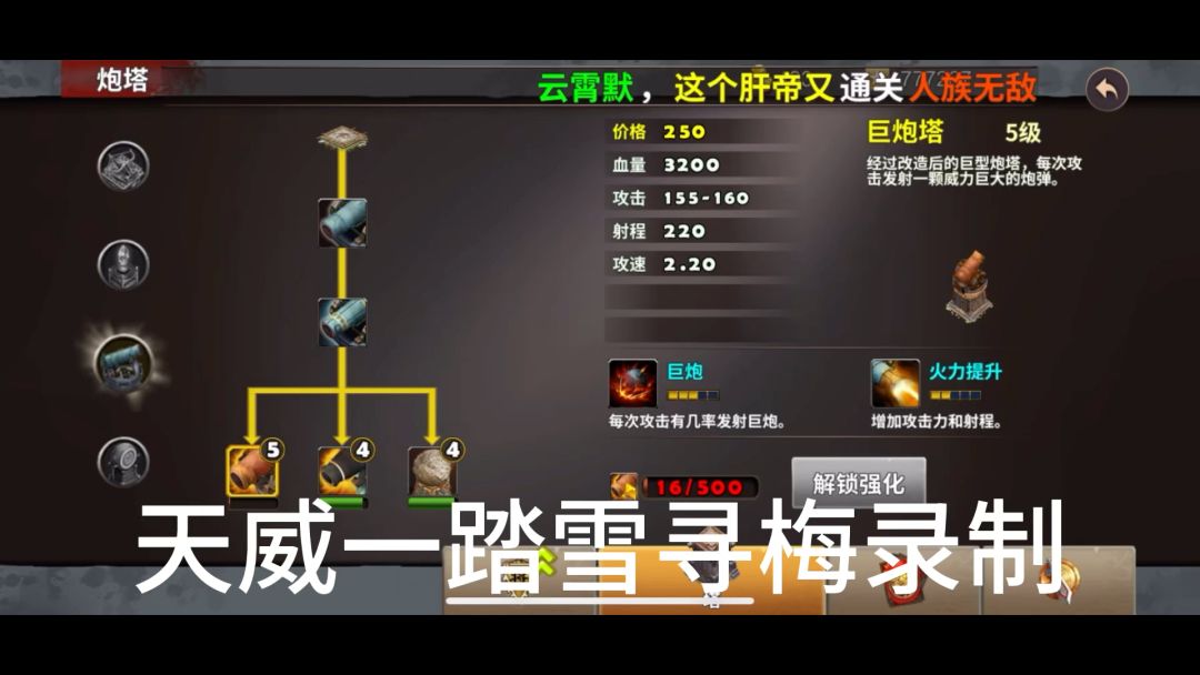 英雄选择刘备、关羽,防御塔使用巨炮塔,战术卡使用妙手回春、破敌、炮塔精通、修罗堡垒、弹道学、复仇巨炮,英雄装备如视频所示,也可以根据自己装备情况进行调整。 打法注意事项: ⒈由于巨炮塔攻击范围小,需要英雄配合防御塔攻击敌人,击杀敌人有机率掉落各种属性晶石,可以派英雄过去捡起来镶嵌到防御塔上面,增加防御塔各种属性, ⒉保护好伐木工人并且击杀所有敌人便可以过关获得奖励,具体打法过程详见视频。