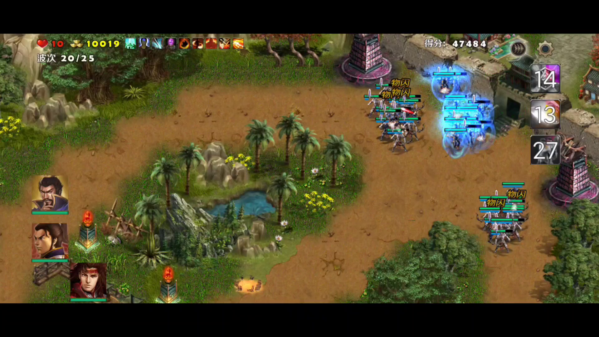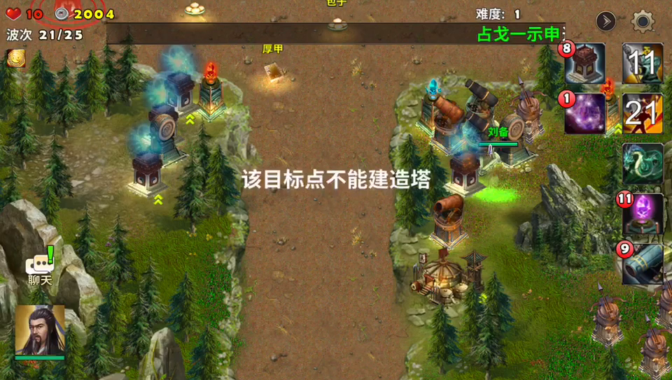 推荐英雄:刘备、曹操、周瑜、荀彧、赵云 防御塔:巨炮塔、滚石塔、狙击箭塔、剧毒箭塔、寒冰塔、天雷塔、粮仓、擂鼓塔、地刺塔 推荐后援:圣兽、力士 推荐卡片:控制系(捕网等)、召唤系(火车等)、增幅系(先者之音等)、防御塔系(各种精研)、主动技能系(肉钩等) 刘备出装:破晓(倚天剑)、湛蓝铠甲、孟德新书、雪橇车 打法思路:难度11以后地形再次发生变化,(难度11-15都是一个地形)这个难度出兵口有两个
