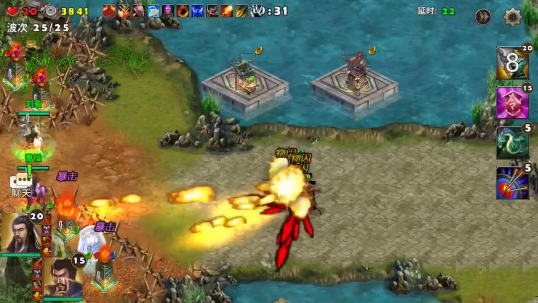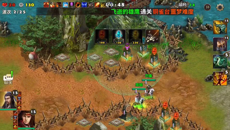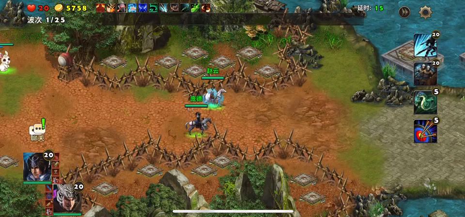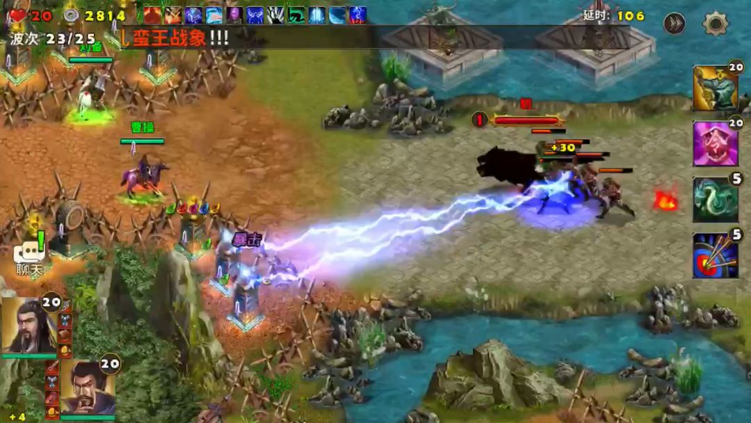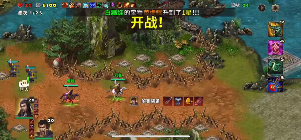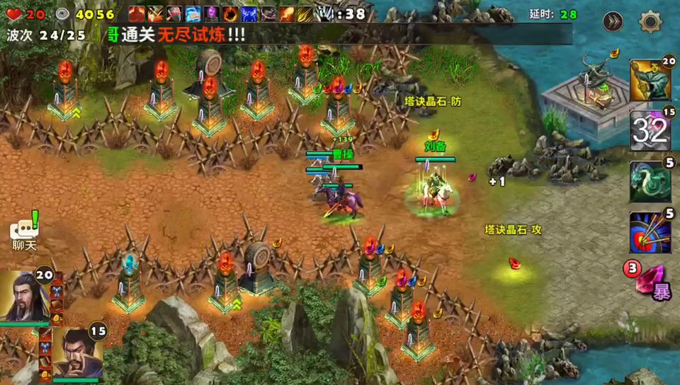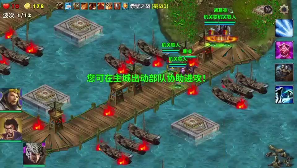 曹操和诸葛亮出战,没有群英阁一样的开局按钮进入游戏即是战斗了,英雄全部快速移动到前方处防守敌人。最前沿可以建造塔防的地方建造巨炮,一排巨炮建造好后再后面建造擂鼓台可以增加攻击还能给旁边的英雄回血。战斗中被击杀的敌人会掉落宝石,这些宝石给前排的巨炮安装后都会按宝石的属性增加塔防的各项性能。远程的宝石会增加打击范围是最好的宝石。请参考视频