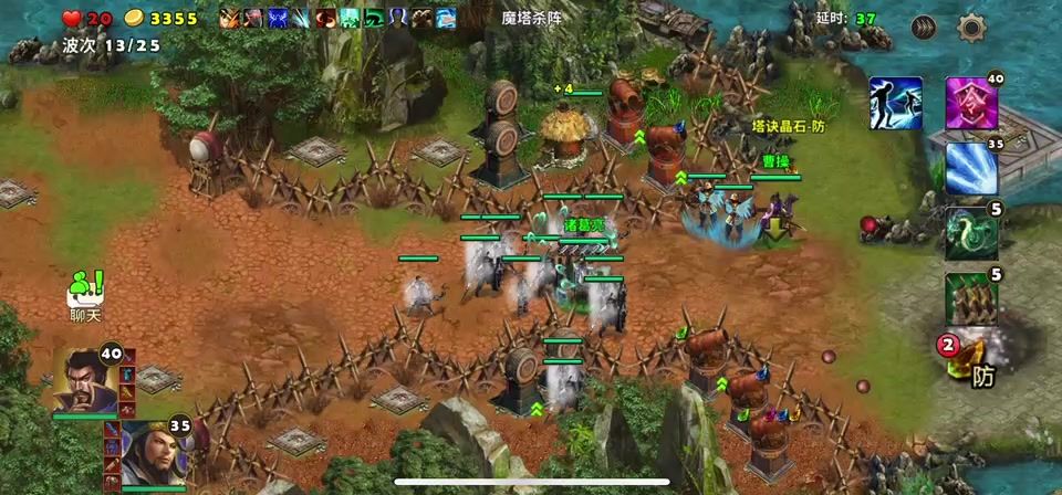 随着各种塔防和战术卡片的不断升级,基本都达到了5级打这个魔塔杀阵。开局就选了刘备和曹操。配装:贪狼。坎蓝宝甲。孟德新书和壁酉鸡,曹操的装备基本一样,战术卡片选用的:妙手回春,破敌,弱敌。塔基加固。先者之音,开局快速建造2个擂鼓台和几个火焰塔后,5个粮草造起来增加金币,再慢慢的把所有的塔防造齐后。前面的升级完善,远程的宝石至关重要,优先安装在前排。刘备曹操有召唤功能,可以应急,这样基本就可以平躺过关