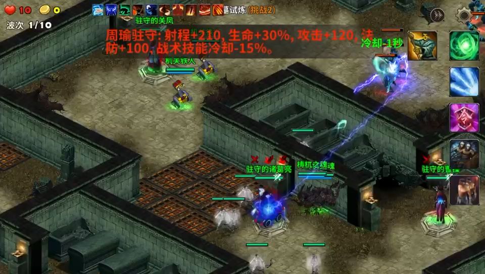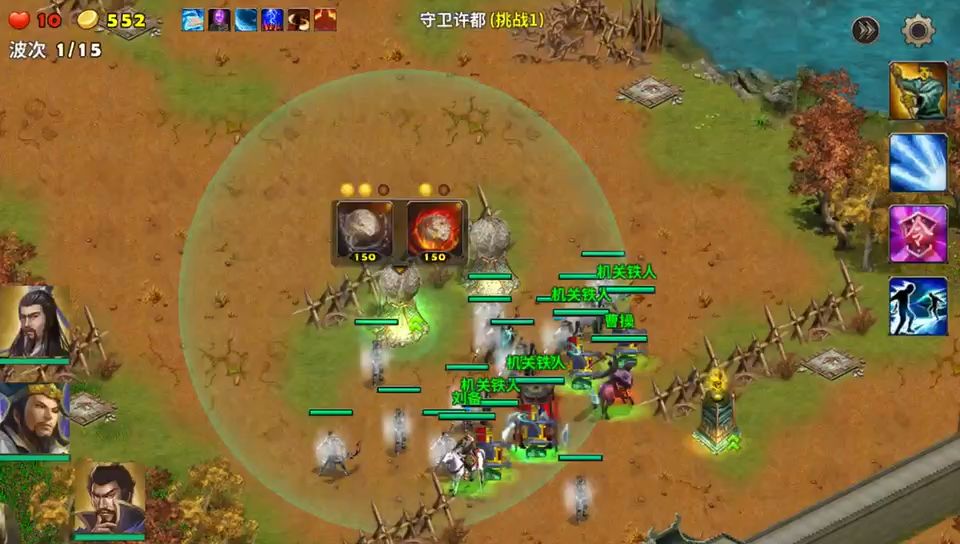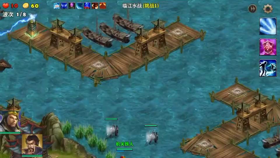 因为是难度剧情就选取自己顺手的武将参战,塔防最好还是用天雷塔,游戏前先把塔防建好几座再开始游戏,敌人的进攻开始了,两路进攻都是从水上乘船南下的水兵,这些兵在船上没有什么攻击力,但是要让它们登岸就棘手了。不但生命值高,防御和攻击都很强。所以我们的这局要点就是水上击沉这些运送水兵的船只。天雷塔尽快升级沿江两侧的天雷塔,后面资源多了可以在大本营再建造几座防御一下。曹操的弓箭手在此局中发挥的作用很大。推荐