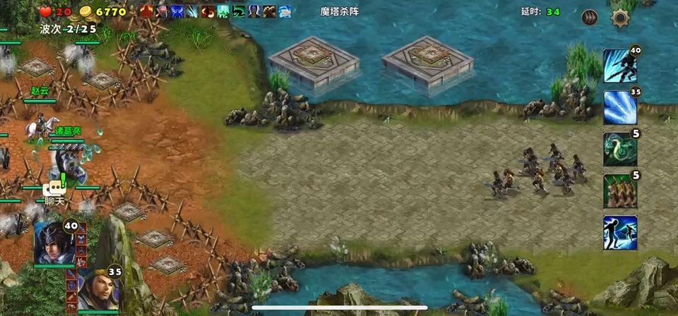 单人模式下作战的玩家选取两员武将进入游戏,前沿战地布设塔防,塔防选取很重要能有效的击败进攻的敌人,推荐天雷塔或者巨炮塔,沿河两岸用远程攻击的弩箭塔,因为别的塔防覆盖不到还有克敌孔明灯的效果。击败敌人会随机掉落宝石,五种颜色的为一组,加成在塔防上效果很好。值得注意的是敌人的投石车攻击我们的弩箭塔,出现就打掉它。最后的BOSS魂吕布不要让其接近塔防,外围打掉胜利通关。