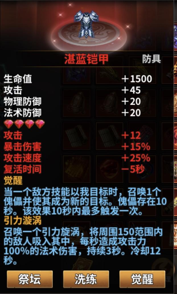 防具类栏之一服装,新人不必在乎几孔只要有一件给英雄武装上在攻打剧情关里就很有用处,其属性自己洗练,本身的属性是在对敌中有一个引力旋涡,将敌人吸入其中,使其造成百分百的法术伤害,防止敌人偷塔很有效果推荐给新人玩家。