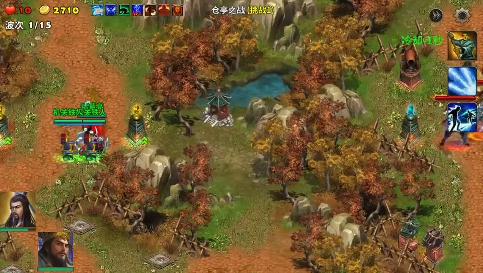 从策马守天关里面的半道伏击开始,难度就越来越大了,此本是半岛伏击的最难的关卡精英难度。我们开局选用能召唤士兵的贾诩和刘备,塔防我们选用攻击高的天雷塔。进入游戏后以前出狼的小岛有了一座桥。狼可以通过桥直接攻击我们的塔防和武将,一定要先在地图上方桥的左边快速建造天雷塔。参战的武将守好我们的塔防,不要乱跑。建议不开加速慢慢打,时刻重点就是防守住上方小岛的狼,胜败就在这里。狼只要出来就用召唤的士兵和天雷塔