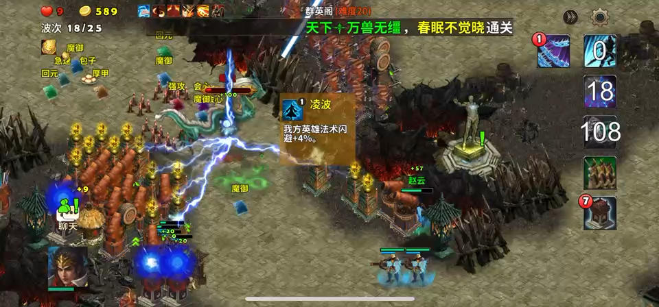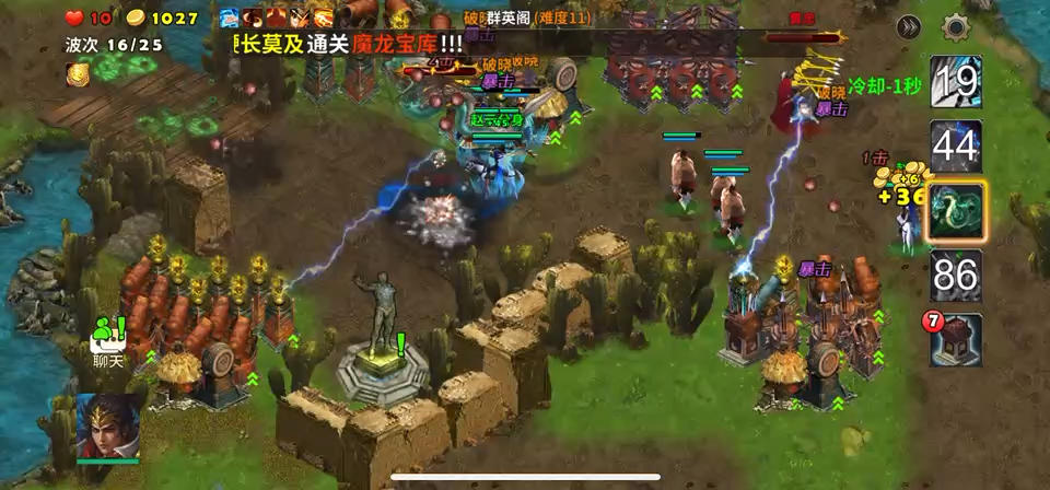 破败的古城废墟要消灭进犯的敌人,这个地图是难度11到15的地图,难度挺大的,个人感觉都比16到20的难度系数大,原因是建造塔防的空地不集中防不住大量的塔防就导致火力不够强大让敌人能顶住攻击移动到后方,还好英雄给力一些不断地释放技能用分身的赵云加上召唤祝福辅助塔防防守,一整场都手忙脚乱的在地狱敌人的进攻,激烈程度很是过瘾还好最后安全拿下缴获敌人10张高级藏宝图。