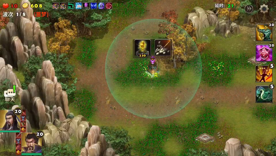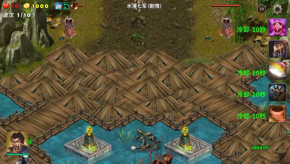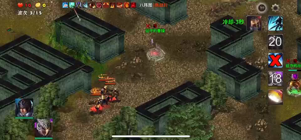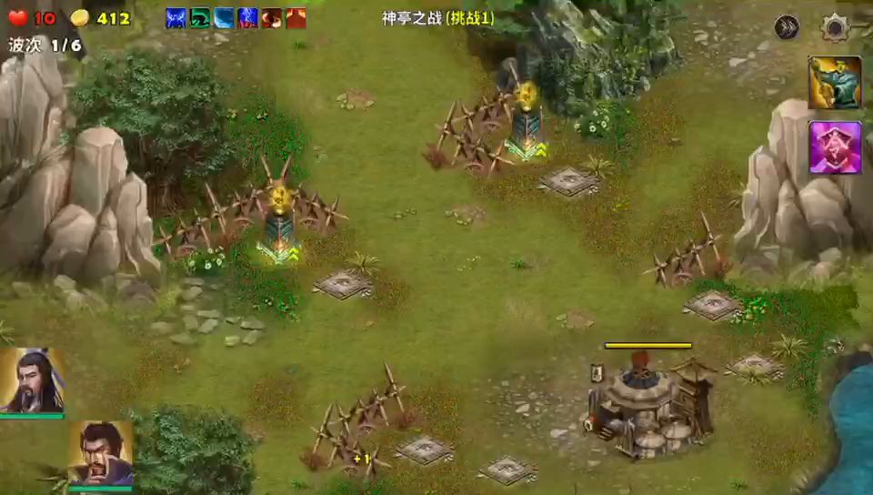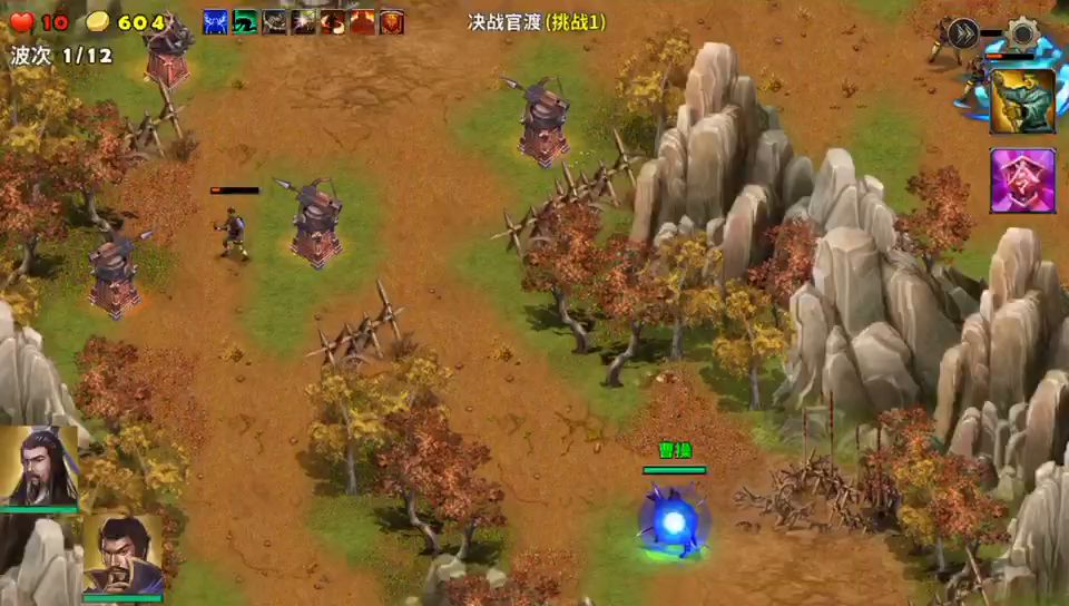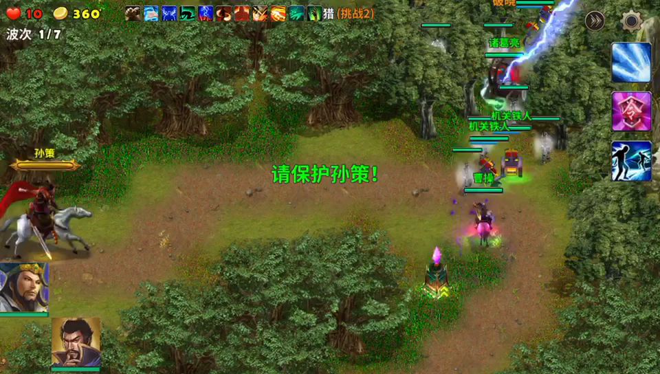 难度剧情的狩猎。开局选能召唤的武将~曹操诸葛亮,曹操紧急的时候可以召唤兵种用来应急。诸葛亮能使用石阵不断布设疑兵,开局一将就要跑到敌人的第一个出兵口,不能人孙策被敌人缠住。缠住就麻烦了,一般是过不去了,打完第一轮的敌人进攻后,迅速的分出一个武将来去左边头上的出兵口,孙策也快跑到了,还是不让敌人缠住孙策,等孙策跑回来,到了我们的火焰塔边上,曹操跟随不断回血续航基本就安全了,最后的上刺客把所有能用的都