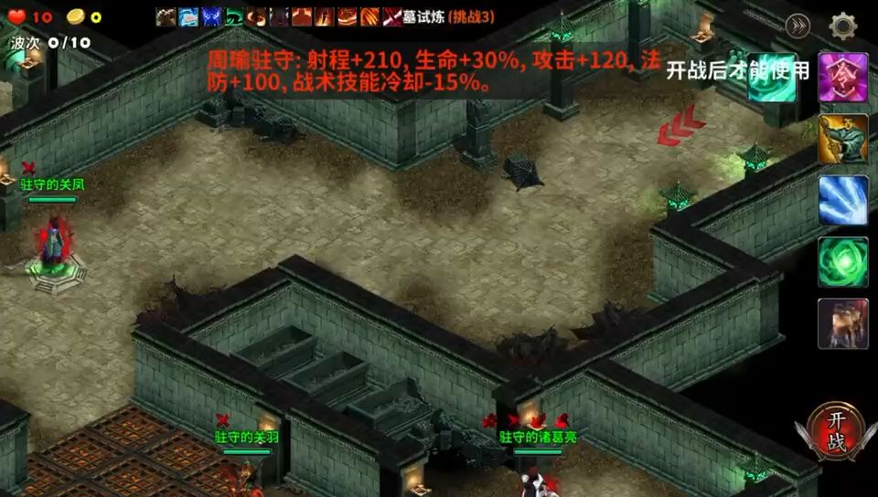 这一关如果没有像样的装备就推荐选择召唤类的武将,平民玩家就选择刘备、曹操、周瑜、诸葛亮等英雄,给这些英雄装备上碧酉鸡坐骑和飞鹰令等饰品,反正是能召唤的都装备上,有召唤祝福的就再加个召唤祝福轻松拿捏这一局,开局直接把刘备曹操的兵放置敌人的出口处,来多少死多少,碰到小Boss和大boos就把周瑜的水兵召唤出来支援助战,排兵布阵的时候记着把诸葛亮放置在第三个点位上加上诸葛亮的光束射线打击敌人,平民玩家也