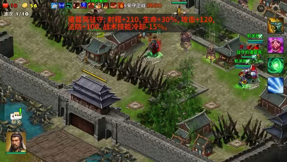 选用刘备、曹操、关凤和诸葛亮进入游戏,战术卡配备弱敌、破敌、召唤祝福和给天雷塔增益的引雷等开局,开局后先布设好塔防后再开始游戏,敌人分兵攻击两个城门很快就会破城而入,这时候用英雄技能打击进城之第,曹操和刘备就负责在两个城门敌人进入的地方放置白耳兵和弓箭手拖住敌人进攻节奏,诸葛亮用光束打击远处敌人,周而复始坚持到敌人进攻结束就完成任务了,三星拿下进入下一关。