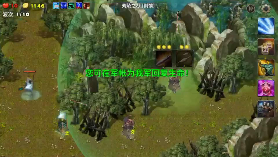 游戏开始前要先把塔防建造起来开始直接等敌人出现就可以了,塔防推荐使用天雷塔,攻击强价格还不贵,敌人第一回合太史慈出来的早应先打掉他,不让后面出来的兵配合他,太史慈打掉后敌人就会从各个山洞涌出,注意不要让他们偷了我们大本营,随着塔防完善敌人会越来越好打了,不过最后一轮出来的曲阿小妹很猛,没有战斗力的玩家建议把英雄移动到塔防出,利用塔防一起打她。首通奖励很丰厚的。