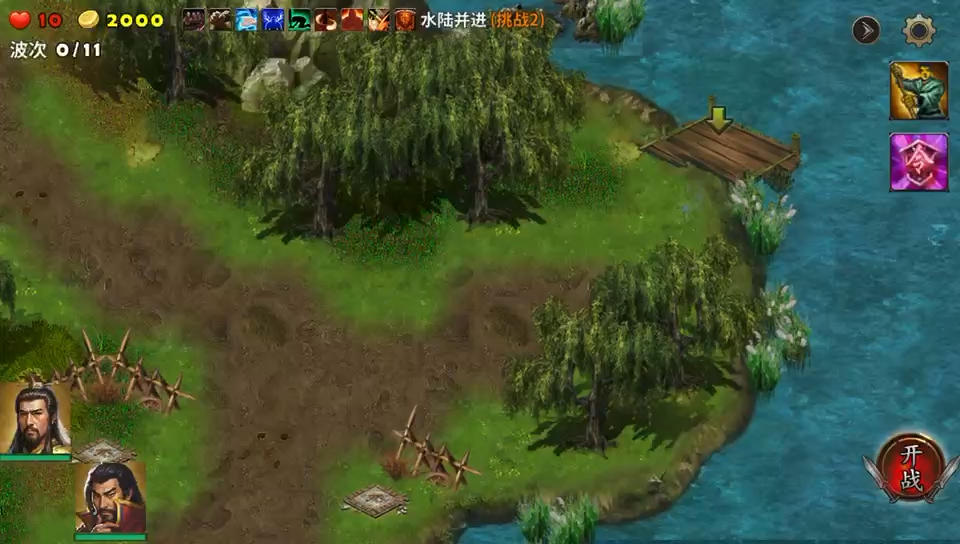 整个第四章的地图都很有意思,难度也适中不是那种虐心的难度稍微用点策略就可以通过的,要是靠硬拼也是不好打的,如水陆并进这一关就有敌人的软肋,抓住就很好打,参考视频开局开局前选好给英雄回血的卡片进入游戏吧刘曹放置在江边会吸引江上敌军也能打击路上敌人,船坞发兵打掉敌人塔防英雄再进敌人大本营给我军回血等攻陷后拿下这关。