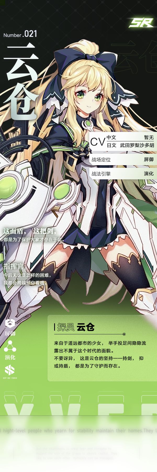 「继续成长下去,就能更好地保护你。」 探员云仓,如同她手中所持的盾牌一般坚毅可靠的少女,在加入SIF时声称是为了保护作为指挥官的你而来。她似乎对你很熟悉,但却无人知晓她究竟来自哪里。 —————————————— 云……云……好耶!是云吞!露槿又多认识了一个字! ——猎潮探员「露槿」