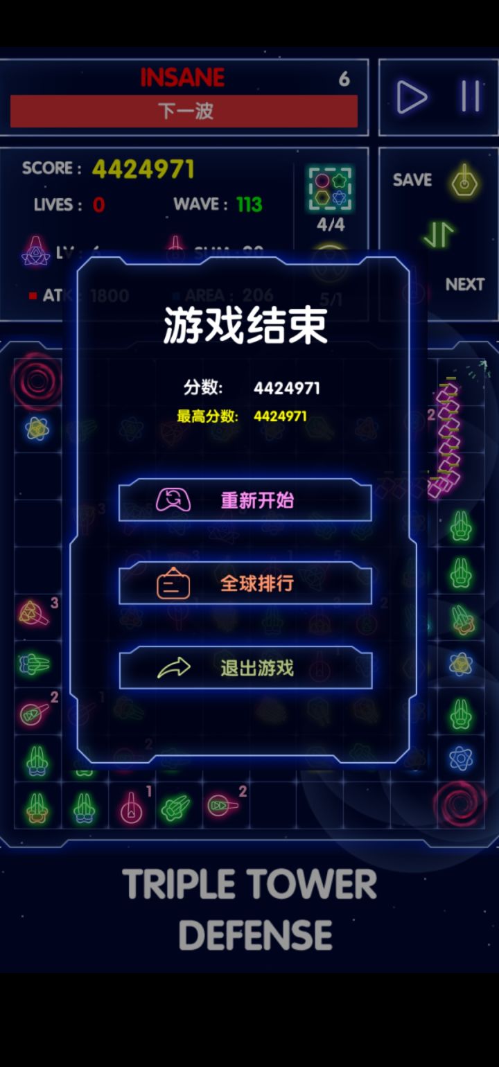 困难模式 4308万分 其实还远没有到极限技巧:1 前期尽量把塔n合1,这样升级到6级塔之后的攻击和范围加成比较高,看图里中间那个黄塔的攻击接近一万,右上的黄塔就只有6000多2 提前计划好塔位!我前期算的很细,在出后面的6级塔的时候就比较随意,导致最后的塔位不理想3 分区摆放不同种类的塔,以防互相干扰4 炸弹可以用来炸自己的塔,方便调整阵型(但愿大家用不上,这都是没算好塔位时的下下策...)