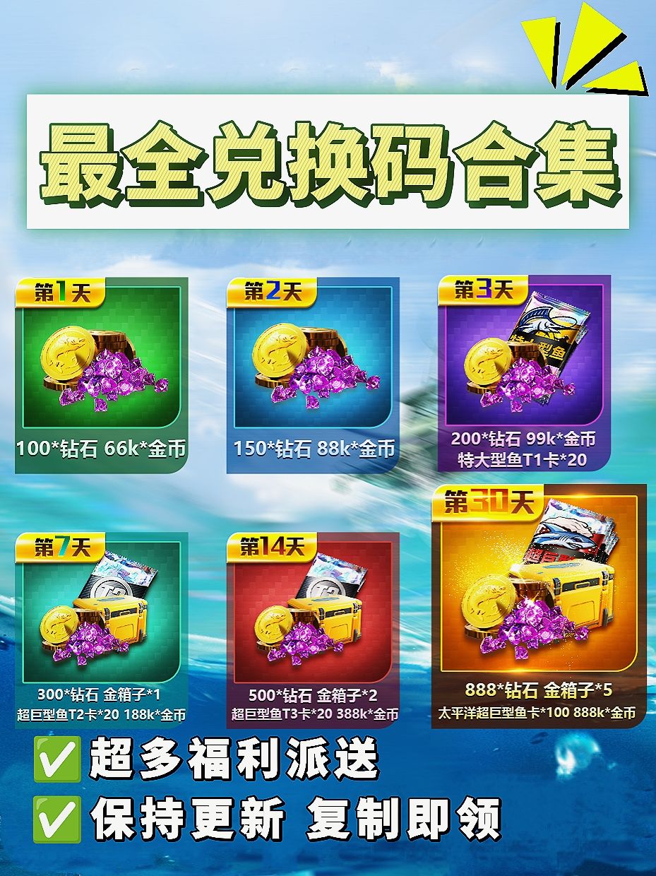 KING8888 内容:终极钓箱*2,金币*388K,钻石*500,超巨型鱼T3卡*20 生效条件:注册天数≥14天 FISHER666 内容:金币*66K,钻石*100 SUPER888 内容:金币*88K,钻石*150 生效条件:注册天数≥2天 FISH6688 内容:终极钓箱*1,金币*188K,钻石*300,超巨型鱼T2卡*20 生效条件:注册天数≥7天 DIAOYU999 内容:金币*9