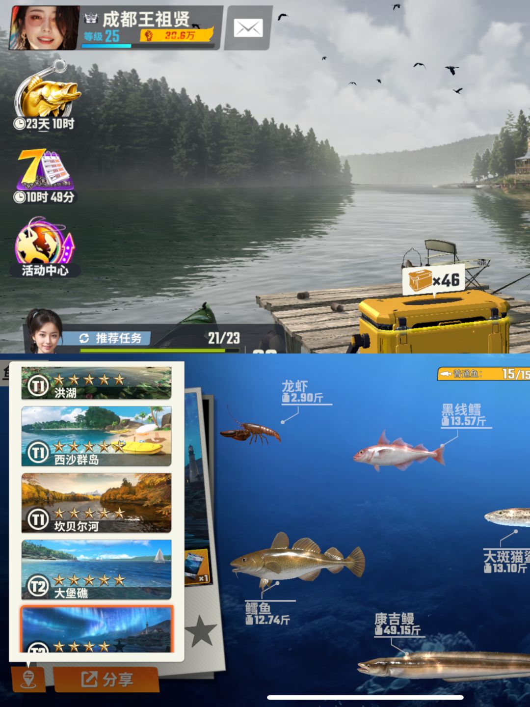 这次讲一些常见的误区。 1.存金箱子。 很多人都讲要存金箱子,等高级再开,这样能换更高级的鱼竿。 我觉得没必要。首先这样玩很压抑,然后其实低级的金鱼竿也是必须给予资源升级的,早期开金箱子并不会造成资源浪费。因为对决里面低级鱼竿也是要用的。 其次游戏里获取金箱子的途径太多了。40级后再屯然后为太平洋准备完全足够了。前期根本不需要屯金箱子。 2.为了防止锦标赛保底分数变高,不升级鱼卡,对各张图“压分”
