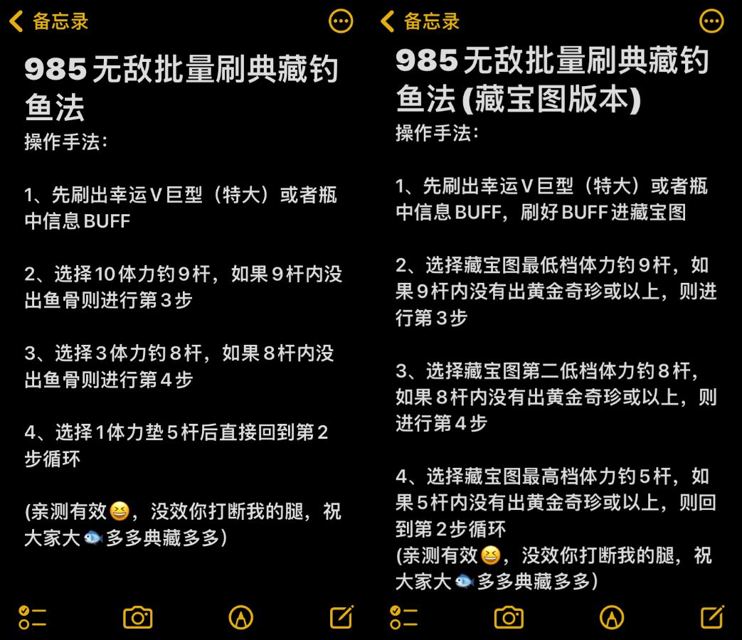 1.首先随便一直图刷出巨型buff(个人认为比较容易出鱼骨) 2.使用10或3体力开钓,掉到第一个典藏鱼骨(出了提示不要把鱼掉出来,直接走第二步) 3.退出换任意一张图,使用和前面图的体力要一样,3-5杆必中典藏鱼骨 4.重复3的操作 典藏鱼就刚刚上钩咯 注:此方法仅适用于典藏鱼骨。只要完成第二步,后面100%成功,嘎嘎连上典藏鱼,一钓一个不吱声😆 趁官方没修复赶紧去试试吧 #游戏攻略 #发现好游