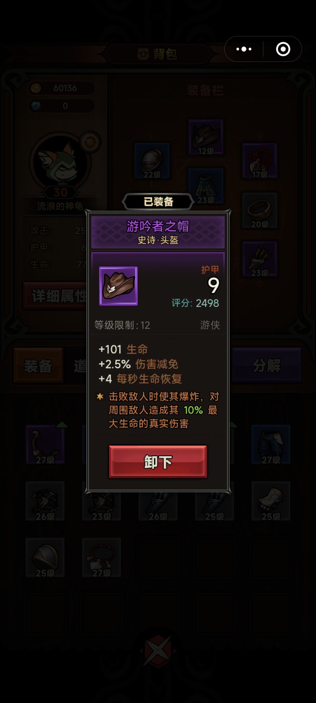 萌新第一天的目标就是冲到地狱45层,但是大多数人在地狱之前都会时不时卡关,在这里我给萌新朋友一点建议 1.大师按照流程走就行,基本不会卡关,如果实在打不过就可以去刷最开始的几关拿速通宝箱(不建议多刷,体力很重要),如果掉落了吟游者之帽(上图),那么恭喜你,前期基本没压力了,切记如果没有掉落圣耀头(图2),那么吟游帽可以一直带着。如果有追加词条的紫装在前期也可以一直带着,可以多很多伤害(如图3,刷不