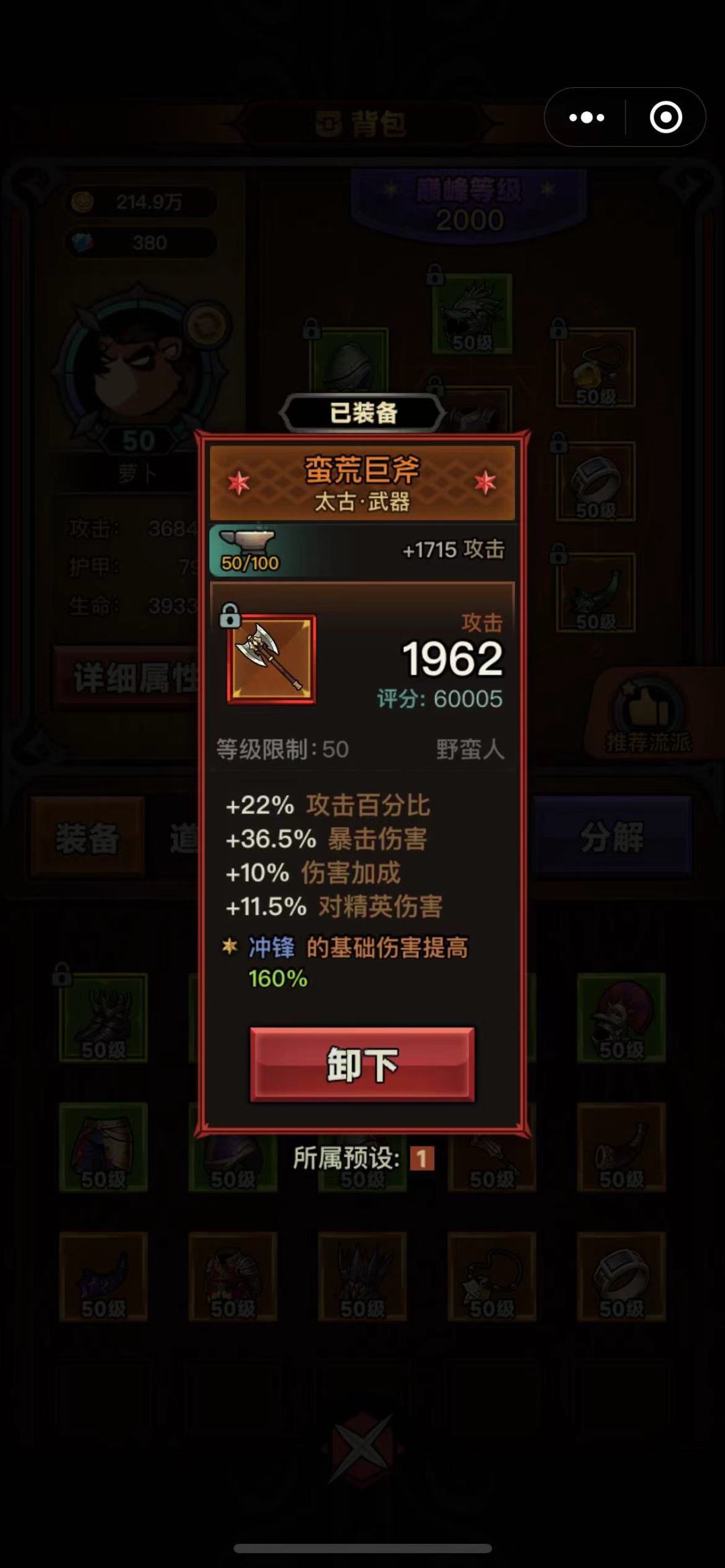 前面是正片,后面是所有配置 值得一提的是,这不是极限,攻击1.6w偏高,最后2分25秒就通关了,还剩很多时间 但这个成绩仅针对这份地图,有的地图怪比较分散,不好聚怪,3分钟不一定打的完 另外,如果能拿到雷电buff,就是攻击附带雷击的,可以大大加快速度,运气好一局能拿两次雷电buff的话,2分钟出头就能通关 对于不想肝的同学,多练习聚怪以及走位 不会聚怪的先熟悉怪的风筝范围,怪出了范围会迅速返回自