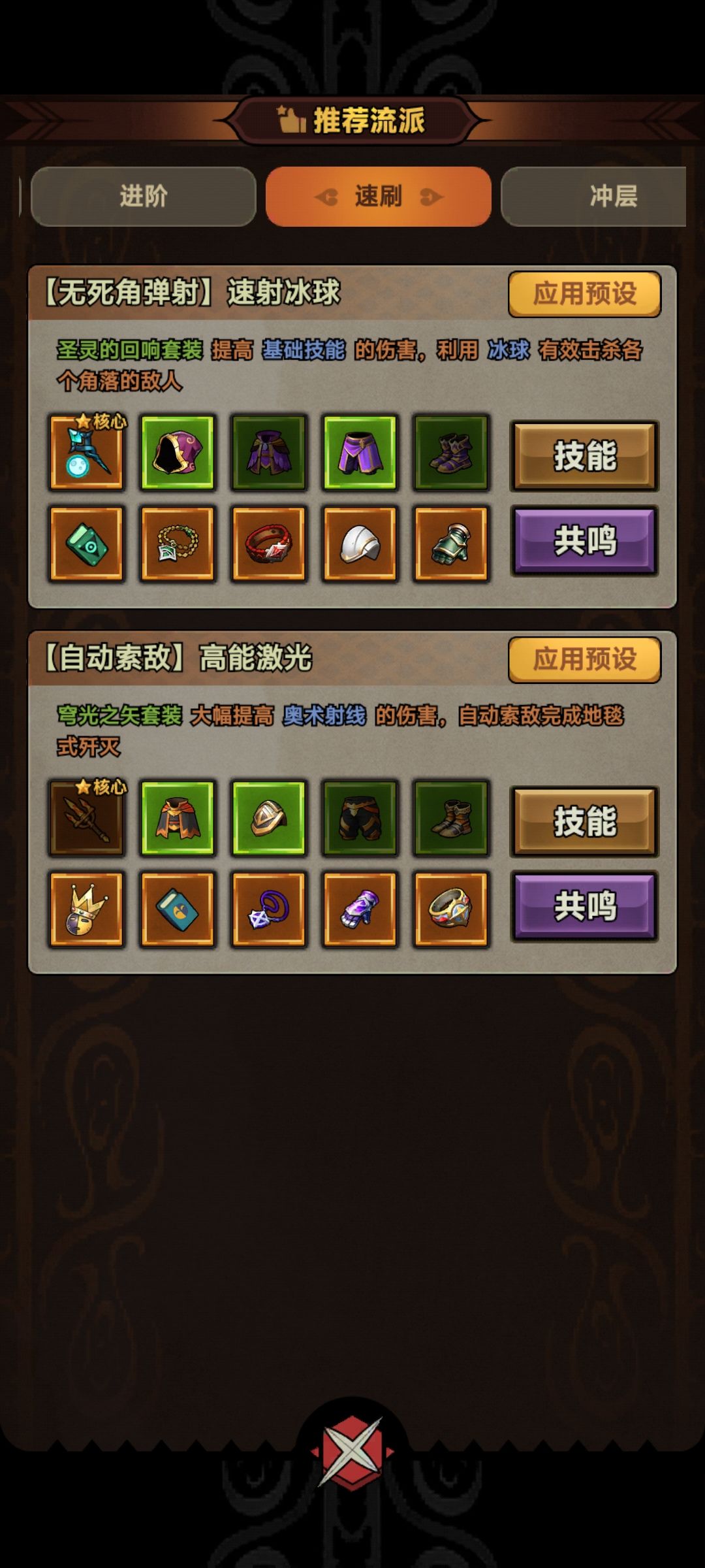 神圣激光套。注意⚠️:只推荐毕业玩家!只推荐毕业玩家!只推荐毕业玩家!重要的事说三遍 。 节点是:一鼓作气 炼金 元素乐园 阵风 松弛 百步穿杨(11.7更新带上遇强则强)七节点。 装备是随便凑的一套,几件都不是完美,因为活动换了铸魂石就随便洗了一套,像头盔只有一条元素伤,之前双爆的都被我分解了汗[表情_汗]所以搞得开局有时候一些怪没秒掉 不过输出机制肯定决定了150层上限肯定是激光流了。 不过基