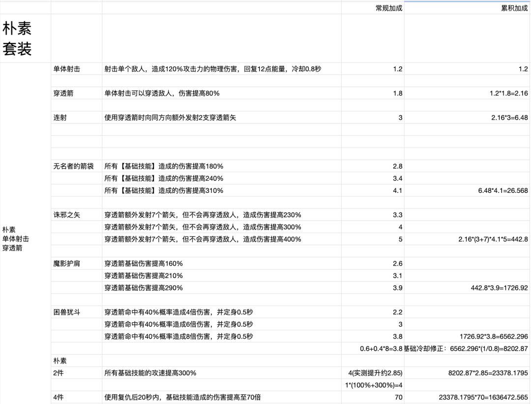 本次统计并列出了游侠朴素套穿透箭硬相关的各个技能装备增伤系数。 如有错漏和不同意见,欢迎表达指正,大家一起完善它。 本图表中,常规加成下的数字表示穿戴该装备或者点满该技能后伤害的倍率;累积加成则表示算上前者的倍率之后所得到的最终倍率。 此外,图表中关于两件朴素套提供的300%攻速,我这里通过游戏中的训练室简单进行了30s总伤测算,初步得出结论,如有错误希望大家指正:穿透箭加两件朴素(提高300%攻