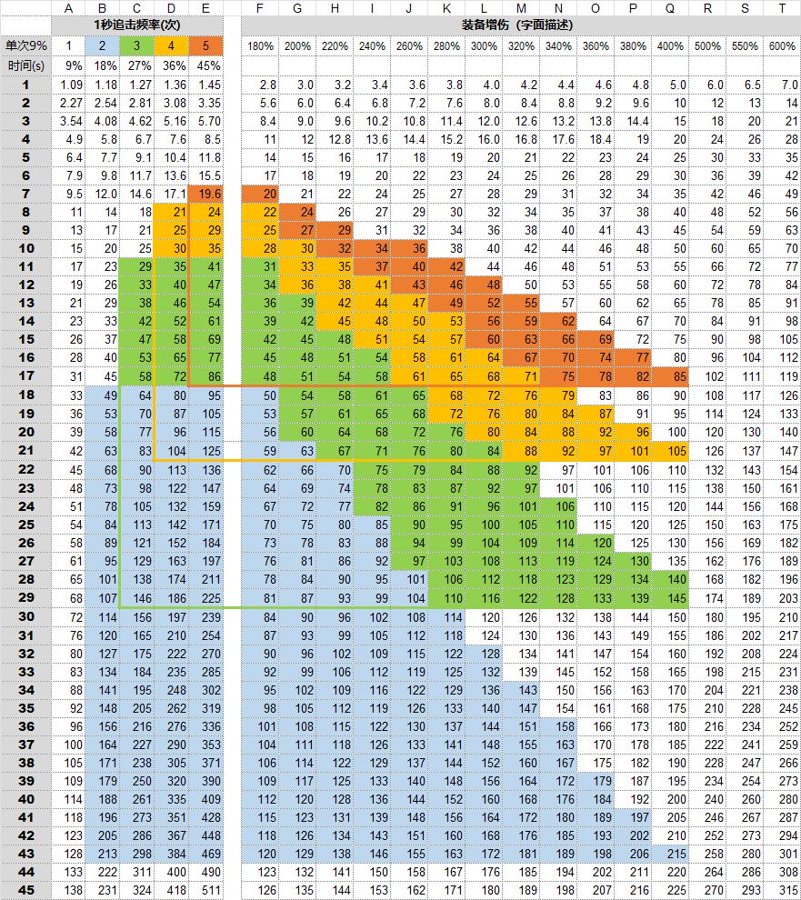 由于追击箭袋的追加伤害需要时间积累,有时候可能不如换成增伤装备收益大。所以编个时间表,自己方便,也供各位参考。测试过自己bd的追击频率后,不用每次测试了,直接参考表格查找对应的时间节点和装备,方便知道什么阶段用什么装备更合适 使用方法例如: 你的追击频次是3,那么找直接看绿色色块的梯度边界,例如J18单元格,表明如果追加两件套换成“伤害提高260%”的装备,在前17秒,追加套不如增伤装备,19秒之