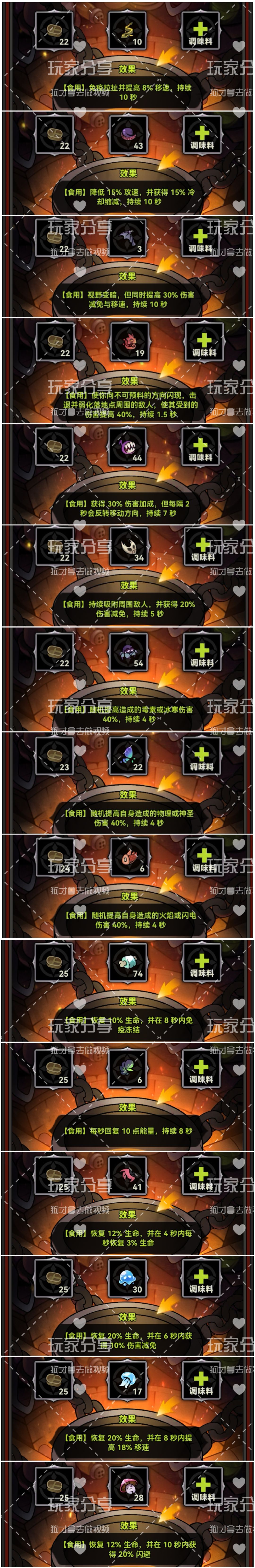 现在论坛里都是些莫名其妙的人,发一大堆又臭又长所谓的攻略视频,我懒得看这些垃圾视频,只好花了点时间自己把所有食材配方全部解锁了。(怀恋上赛季 云端闲着等几个无私奉献的大佬在的时候,应该是这个昵称吧,记错了望包涵[表情_斜眼笑]) 前面三张图对应三个系列的配方。 最后一张图说明一下,就是前面三张图配方的加强效果,分别可以强化配方的范围、强度、时间。 某些配方经过强化之后,基本上可以刷图的时候全程覆盖