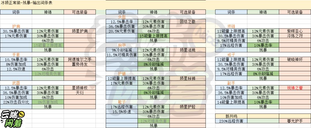 装备选取: 套装x4 灵风肩 蓄势待发 阿德维尔之手 噬魔毒戒 淬炼 紫晖 暴伤副手 维权 弹射杖 自行决定穿萃 灵韵萃取选择远伤手 以下属性均已计算为最优解: 且以满熔炉计算 神语第一二三五条均为毒伤暴伤攻击残暴 []内为神语第四条 头:暴率 暴伤 毒伤[能量] 肩:毒伤 暴伤[能量] 手:攻速* 暴率 伤害加成[精英伤] 胸:精英伤 cd[精英伤] 腿:能量 毒伤[能量] 脚:远伤[攻速*] 项