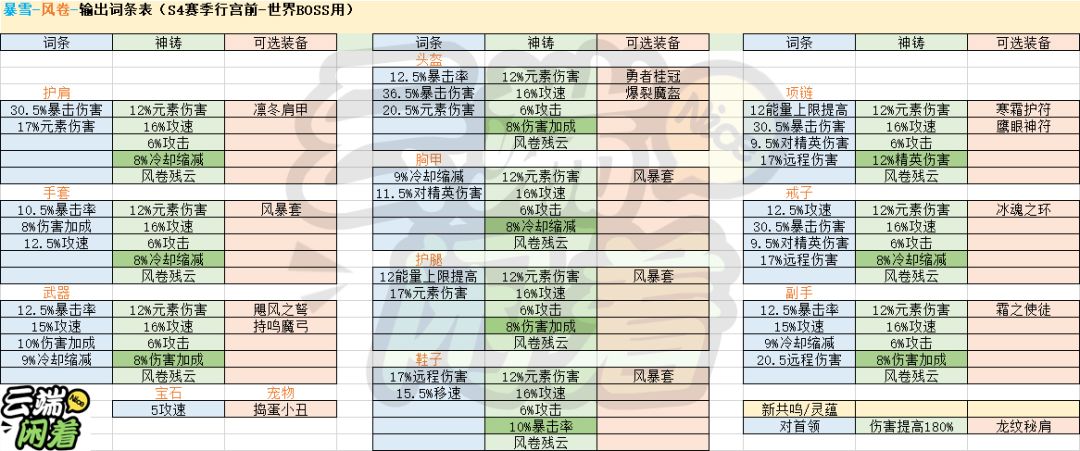 前排致敬法师普攻的神 @不穿套装才是勇士 套装佬 这盛世如你所愿 @釵佬 釵佬这赛季鸽了 但釵佬的档位表一直没鸽 @风筝@一天一个648 大佬参与测算 辛苦了 装备选取: 套装x4 灵风肩 蓄势待发 阿德维尔之手 破晓 淬炼 紫晖 暴伤副手 维权 祭祀神魂 自行决定穿萃 灵韵萃取选择远伤手 以下属性均已计算为最优解: 且以满熔炉计算 神语第一二三五条均为火伤暴伤攻击残暴 []内为神语第四条 头: