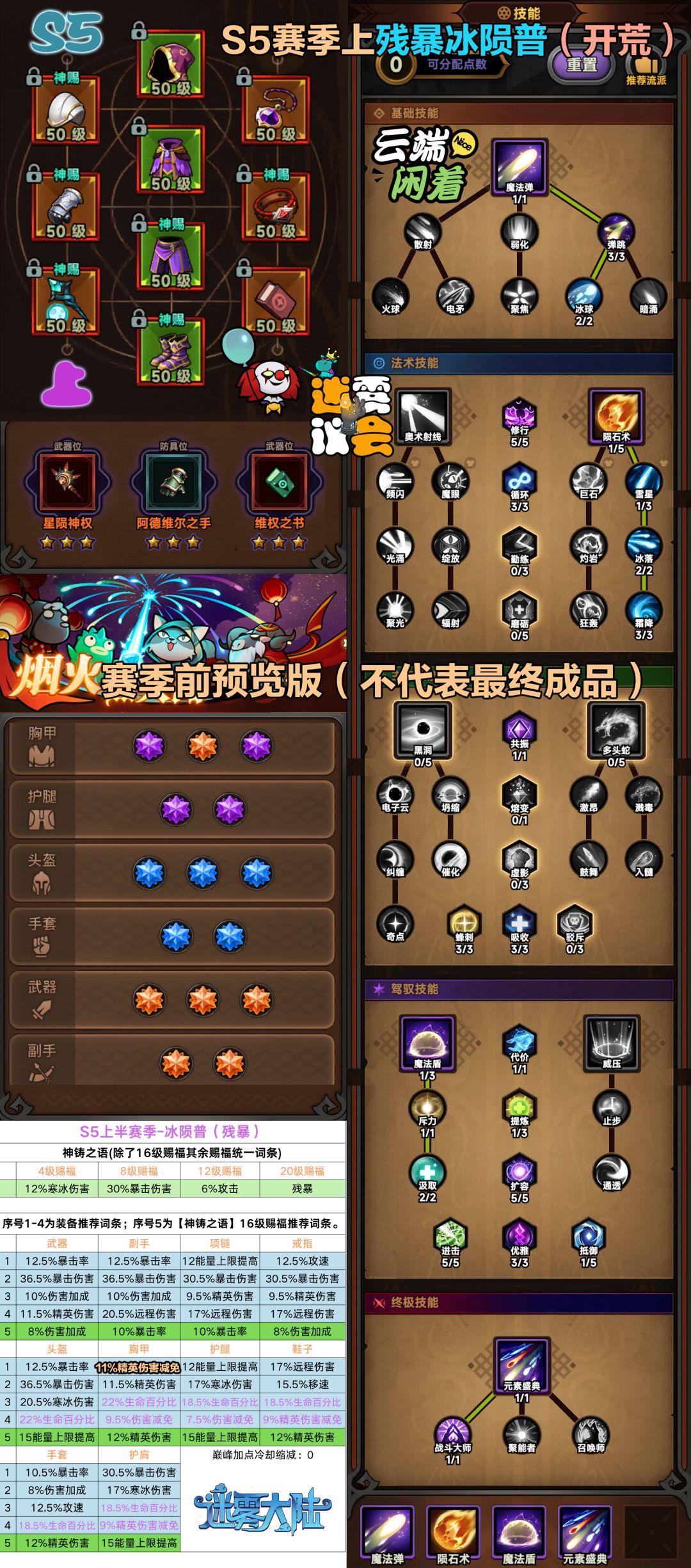 #游戏攻略 #迷雾大陆魔法师 一、基本词条选择 装备神铸和上赛季一样,不需要改,把上赛季的增伤头改成项链。 词条方面细节 1.攻速131%以上(141最佳神铸16%+戒指手套各12.5%) 2. 0cd 3. 优先爆伤,然后依次伤害加成,能量上限,远程,攻击力,精英伤 二、食物选择 看了一圈都没什么用说两个实测下来我觉得还可以的 1.-30%cd 进度区间是不错的有蓝用,可以把大招元素盛典前置