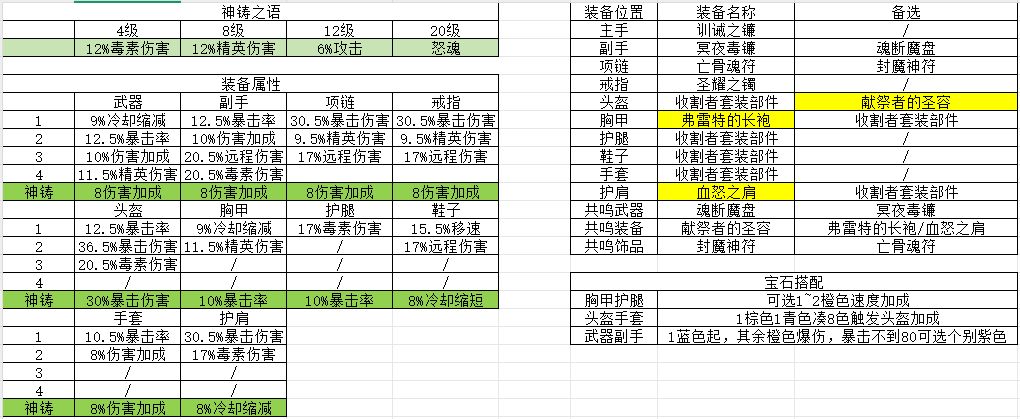 简单归类了下毒镰的属性,主副手属性可选比较多 主手:精英伤害,暴击,爆伤,伤害加成,冷却缩短,毒素伤害,攻击百分比 副手:伤害加成,暴击,爆伤,远程伤害,毒素伤害,攻击百分比 都是可选,面板暴击80左右,冷却50以上基本就行,有免疫减速翅膀可以考虑不带加速宝石