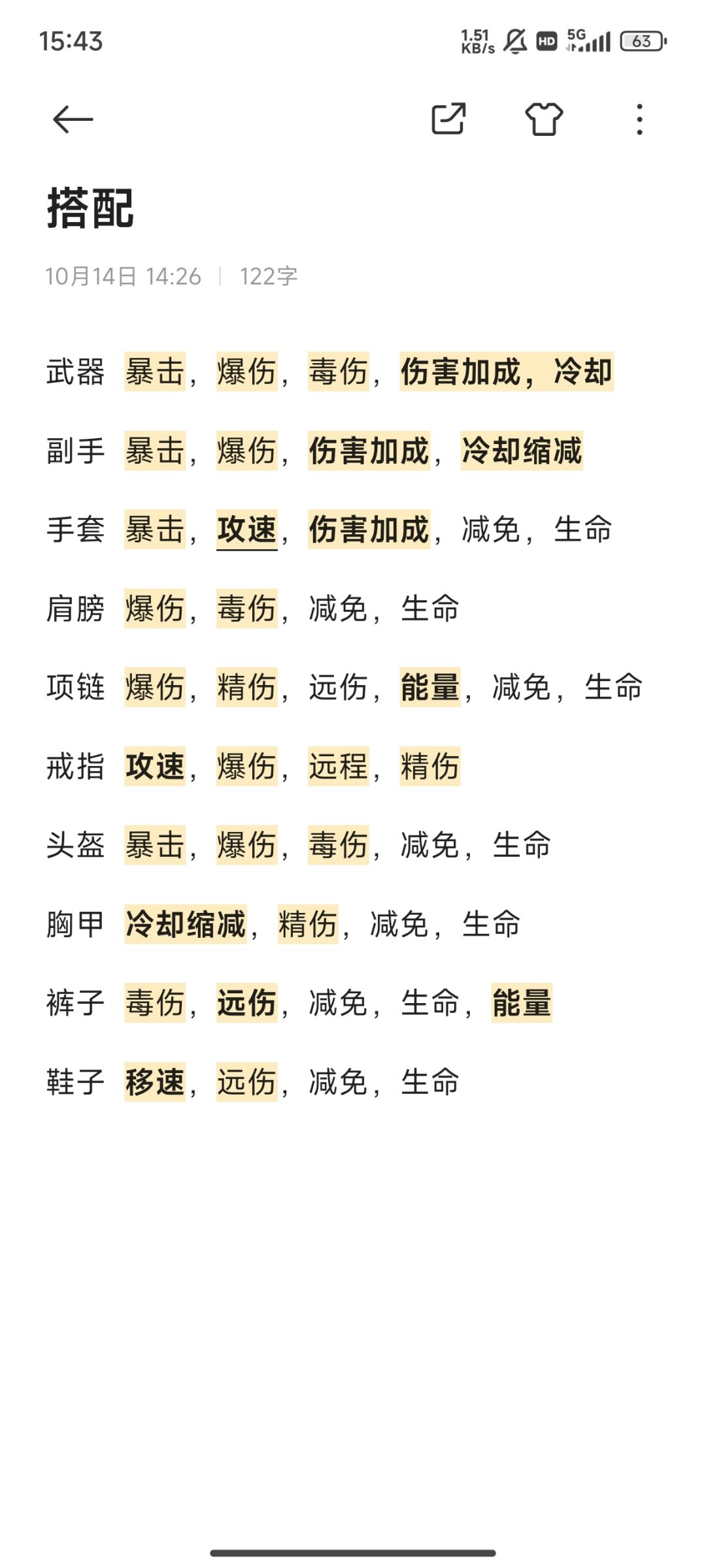 武器 暴击,爆伤,毒伤,伤害加成,冷却缩减 副手 暴击,爆伤,伤害加成,冷却缩减 手套 暴击,攻速,伤害加成,减免,生命 肩膀 爆伤,毒伤,减免,生命 项链 爆伤,精伤,远伤,能量,减免,生命 戒指 攻速,爆伤,远程,精伤 头盔 暴击,爆伤,毒伤,减免,生命 胸甲 冷却缩减,精伤,减免,生命 裤子 毒伤,远伤,减免,生命,能量 鞋子 移速,远伤,减免,生命 说明:因为我玩的是法师所以写的属性比如: