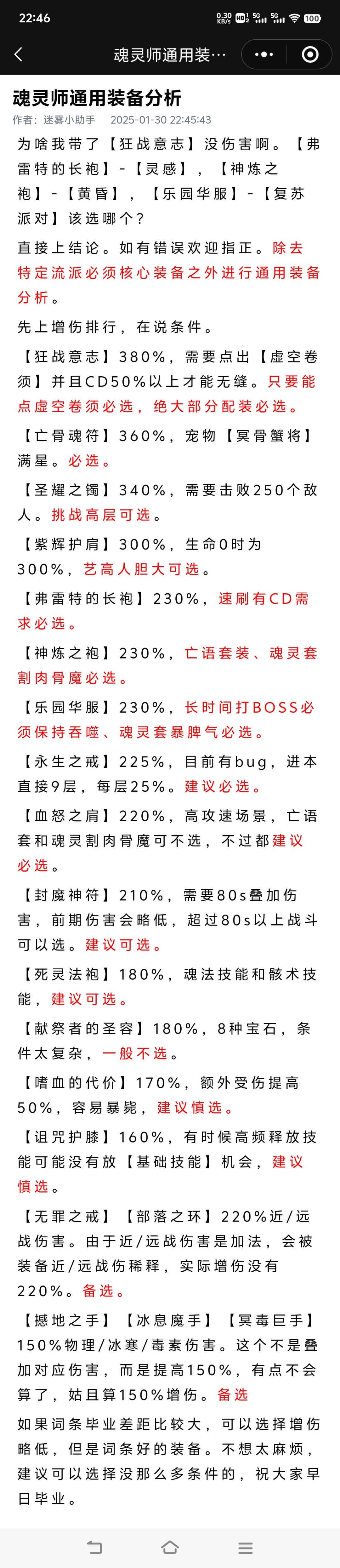 魂灵师通用装备分析