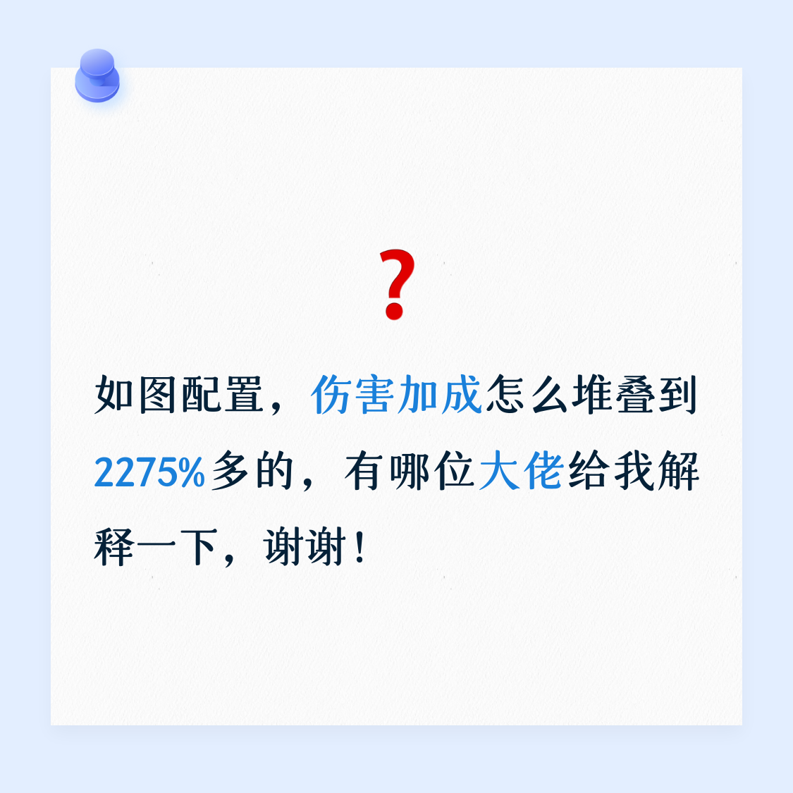 如图配置,伤害加成怎么堆叠到2275%多的,有哪位大佬给我解释一下,谢谢!