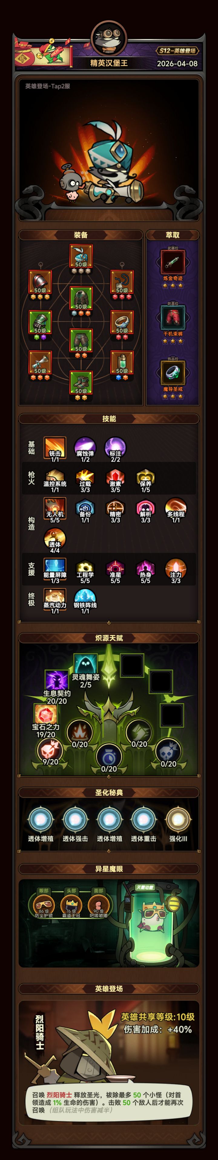 以下观点仅代表个人理解,如果有大神感觉一派胡言,划走即可 首先我的魔眼和行宫还差的远,魔眼是79/87/99,行宫是4/18/16,打的18关,没感觉什么难度。如果魔眼和行宫都满了的话过20应该不是问题。 1:装备 我用的魔焰肩膀替换了团结头,硬度上更胜一筹,并且后续的伤害更高,同时有助于前期控血 2:技能 我用的是魔法盾,虽然威压的伤害更高,我也尝试过威压,但是感觉手感还是魔法盾更好,毕竟都能打