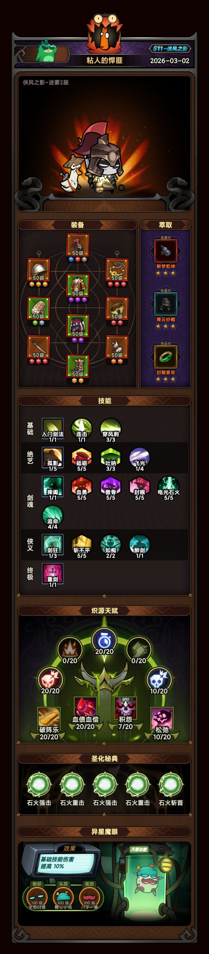 构建了一套侠客的引线捭阖BD,感觉可以和排行榜的普攻捭阖比一比。本人零氪玩家圣化太低,大佬可以试试。头盔+项链2件引线,龙骧战盔可叠3层元素弱点,加成5.8倍。江潮的佩剑+异星魔眼,一秒叠12次引线,20秒基本叠满21倍加成。副手江湖一梦加成3.6倍,另加连击值常满,可以考虑狂忍手。冲层时间主要耗在boss战,这套BD打boss越战越强,小怪阶段时间稍长,可以不戴弑王手。其他可以考虑的装