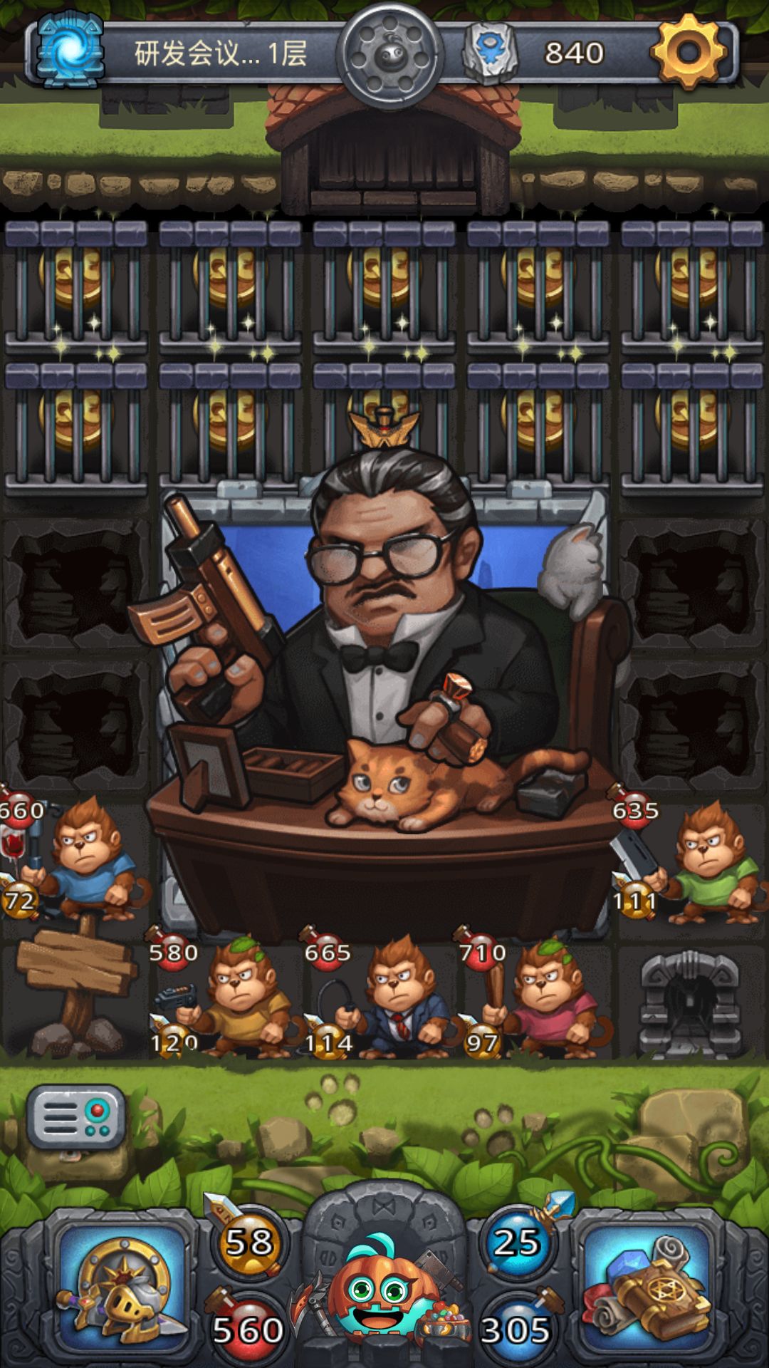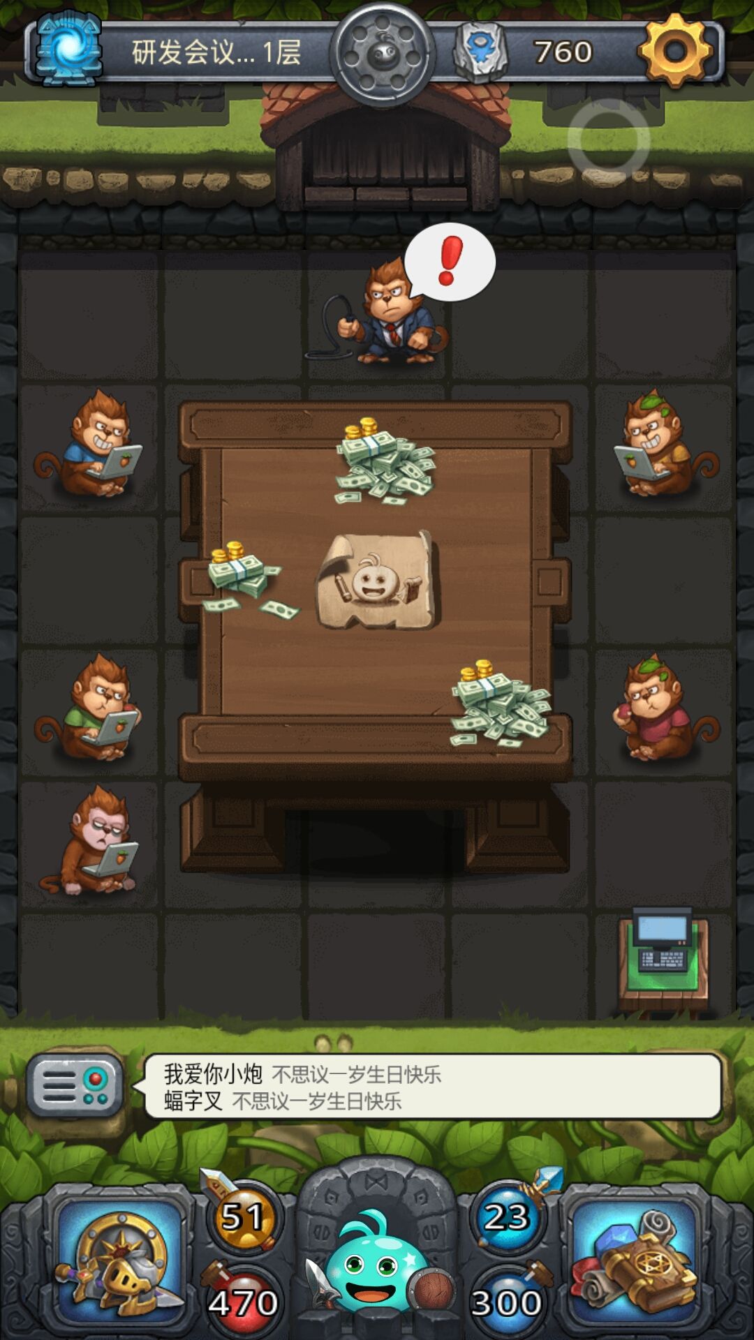 死猴子:点10次会给2钻 图一医疗图:20级以上,乱入一只异性怪物,打过通关结算药剂(效果加攻,不会反击,持续本层,3次);通过几率增加随机猴子属性。 图二影视图:随机出全部蓝鲨,打完给5蓝鲨碎片,上限应该是20。 图三收银台:棒棒糖小孩,打掉给棒棒糖,加猴子1攻10血;随机掉落10qc币,一局上限10。 图四乞讨图:24级以上随机乱入猴子(之前发的是25忘记改了9只怪的时候出猴子是有可能得),打