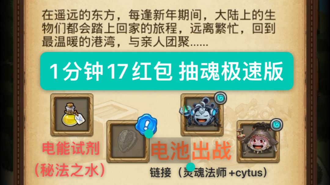 我改进了一下抽魂速刷的打法。 电池出战,链接灵魂法师+cytus 不带神器 带电能试剂(或者大佬带秘法之水)刷一体图,只升2级看怪,然后领工资,前面2、3层只捡钥匙下楼不进洞不点任何建筑,第四层找一个怪先用灵魂法师技能然后用cytus技能复制得到一个芯片,然后进自助超市,先把前三种年货买一个,然后后两种年货拉满,出商店下楼。 Boss层不激活,先用背包里的芯片然后灵魂法师技能抽boss魂,再用cy
